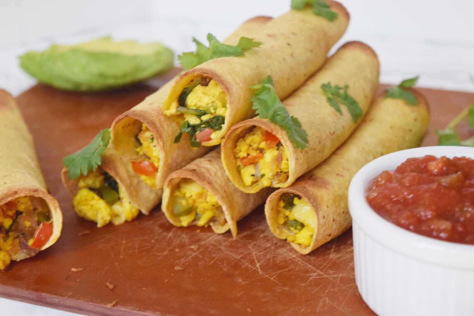 1 Preheat oven to 425. Begin by adding your diced red onions, red peppers, and green onions to an oiled pan and cook for about 2-3 minutes over a medium heat. 2 Add minced sausage and cook for 2-3 more minutes ur until sausage is lightly browned. 3 Add in tofu and additional seasoning to make tofu scramble (recipe here), then stir in spinach and cook until wilted. 4 Begin forming your taquitos by adding small portions of the breakfast mix and "cheese" to each tortilla, roll, then place on a pan with the seams down. Lightly spray with olive oil (optional) and place in the oven for about 10 minutes or until lightly browned. 5 Once done, remove from the oven and transfer to serving dish (so that they aren't still cooking on the hot pan), garnish with cilantro and enjoy with salsa!View original recipe